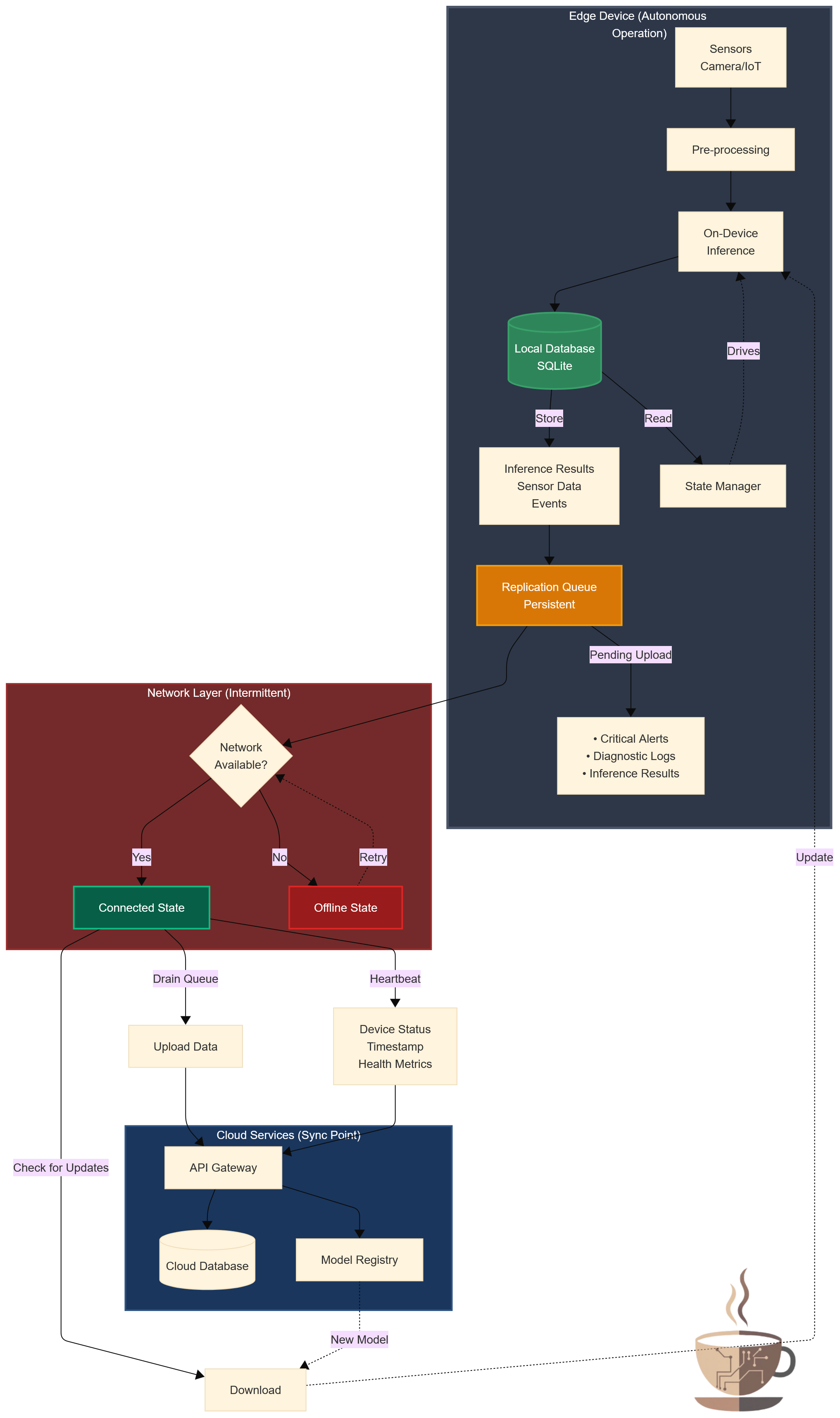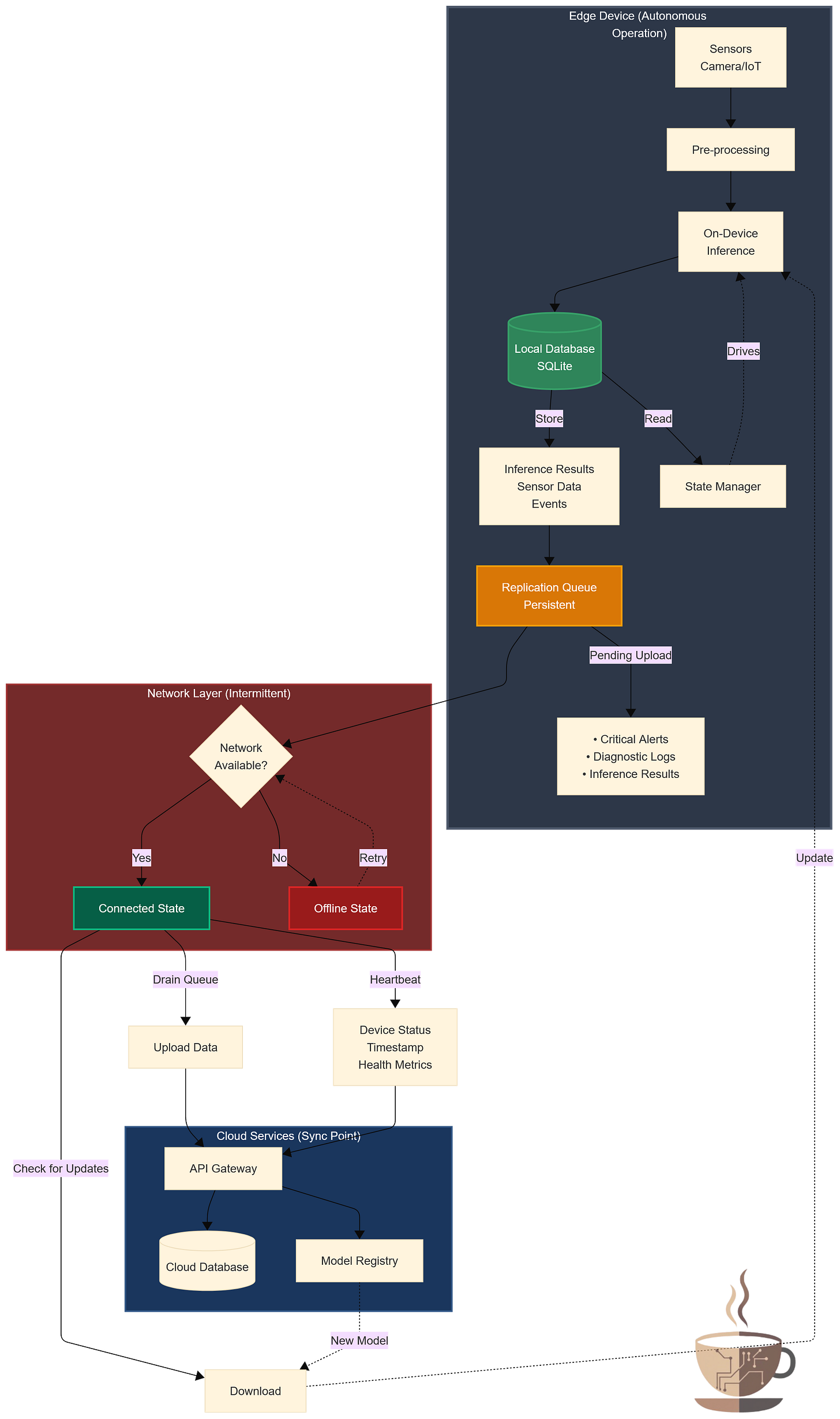 Replication queues: any action that requires cloud coordination—uploading a critical alert, requesting a model update, logging a diagnostic event—goes into a persistent queue. When connectivity returns, the queue is drained. If connectivity drops mid-operation, the queue persists across reboots.