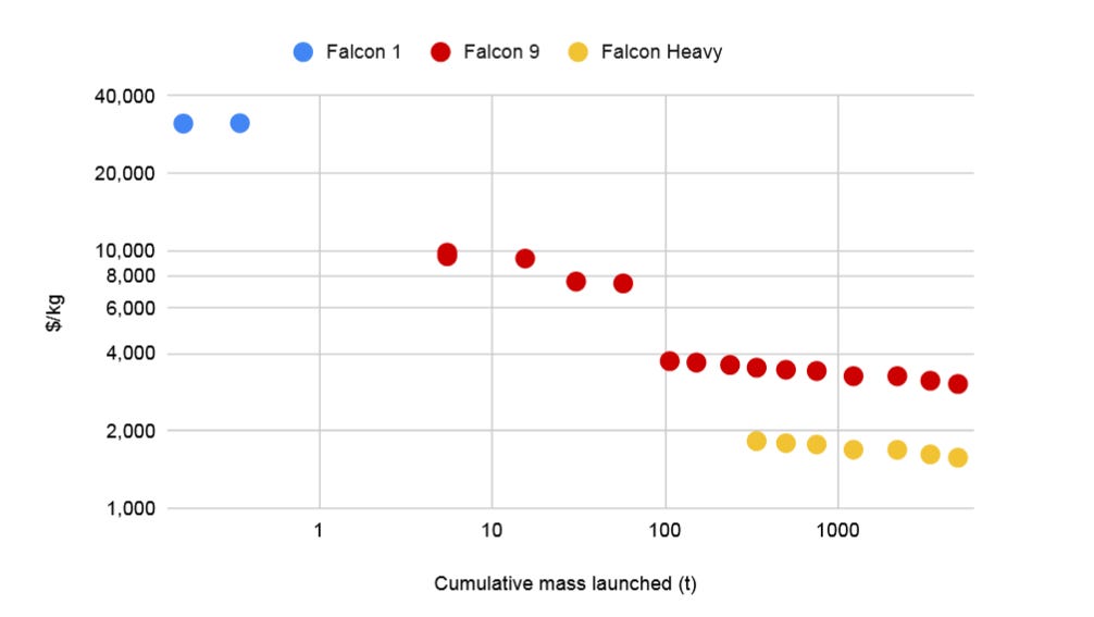 Thanks largely to SpaceX and the brutal, consistent logic of its 20% “learning rate” (every doubling of cumulative mass launched, the price per kg drops by ~20%), we are on a collision course with a magic number.
