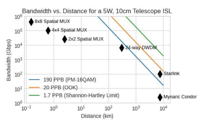 At this “close” range, there’s enough power to use high-bandwidth COTS (Commercial-Off-The-Shelf) tech like Dense Wavelength Division Multiplexing (DWDM), which crams dozens of signals into a single fiber (or in this case, a single laser). Get even closer—say, under 10 km—and you can use spatial multiplexing, which is like having an array of parallel laser-beams.